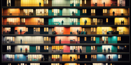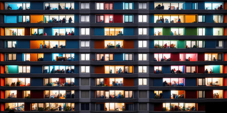 Contemporary Apartment Building at Night with Illuminated Windows Showcasing Diverse Home Activities