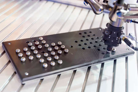 A robotic mechanical arm arranges small metal balls. The machine is demonstrating its speed and accuracy executing tasks.