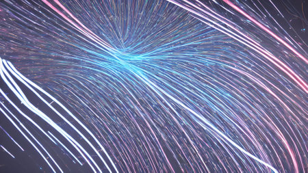 This image captures a mesmerizing burst of light that radiates from the center, creating a stunning display of blue and gold streaks. The vibrant lines spread out in all directions, evoking a sense of energy and movement. The contrast between the dark background and the bright, colorful lines adds to the visual impact, making it appear as if the light is exploding or spreading outwards in a cosmic dance.