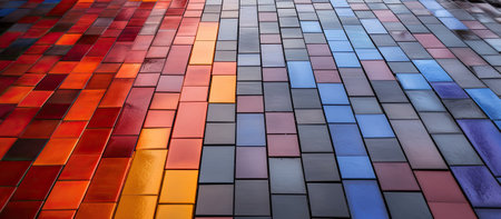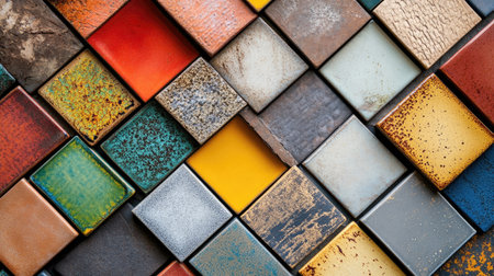A colorful mosaic of tiles with a variety of colors and patterns. The tiles are arranged in a grid-like pattern, creating a visually interesting and dynamic composition. Scene is vibrant and lively