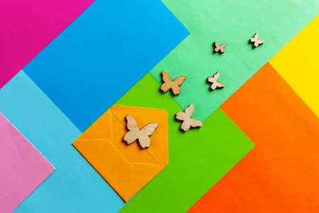 Close up photo of batterflies silhouettes on varicoloured colorful paper background. Top view, spring and various holidays and events concept