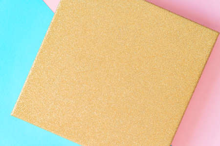 Minimal creative background with sparkling gift box on pink and blue backdrop. Copy space for your text