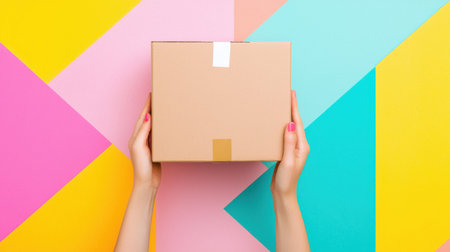 Woman's hands gripping sealed cardboard package against vibrant geometric backdrop featuring yellow, pink, turquoise, orange colorful shapes, highlighting shipping logistics concept
