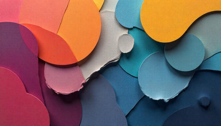 Textured paper collage with vibrant circular and organic shapes