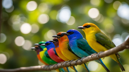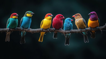 A stunning display of eight vibrant tropical birds sitting on a branch, showcasing a breathtaking array of colors that highlight nature's beauty.