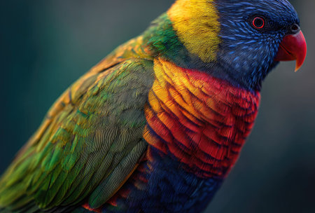 A striking close-up showcases a rainbow lorikeet, its plumage a riot of color. The bird displays vivid hues of red, yellow, blue, and green. The soft, blurred background enhances the focus on the subject, suggesting a natural environment. Suitable for a variety of creative and illustrative projects.
