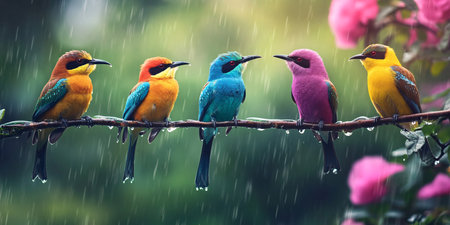 Colorful bee-eater birds sitting on a branch in the rain
