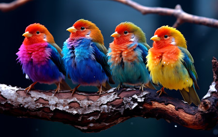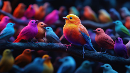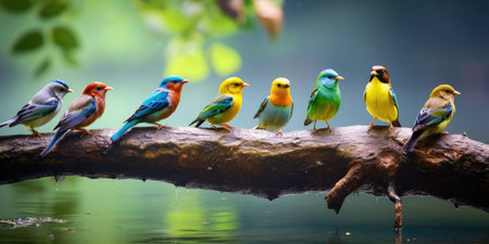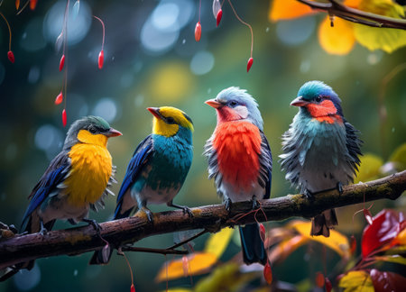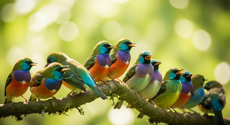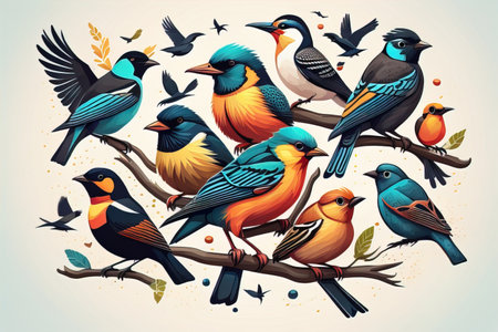 Vector illustration of a group of colorful birds sitting on a branch. ai generative
