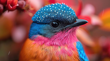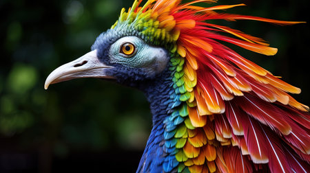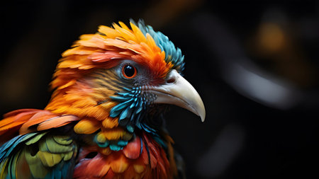 A vibrant portrait showcasing the intricate details of an exotic bird, highlighting its colorful plumage and captivating gaze in stunning detail.