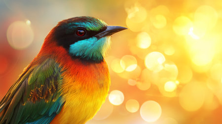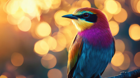 Detailed view of a colorful bird in sharp focus, with a softly glowing background of light patterns that create a harmonious and visually appealing contrast.