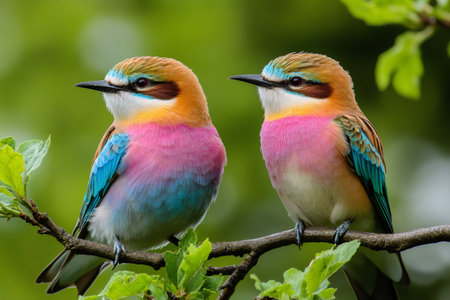 Two European bee-eaters perched on a branch are showing their colorful plumage