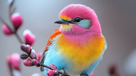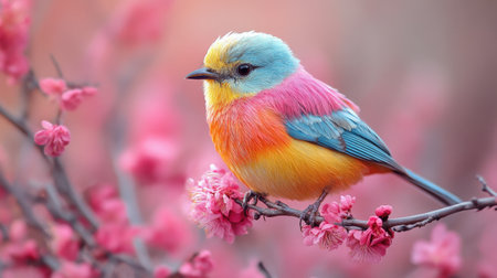 Vibrant Songbird Perched Among Cherry Blossoms, A Vivid Display of Spring and Natural Beauty. Colorful bird among cherry blossoms in spring bloom.