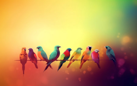 Row of birds sitting on a wire, each bird is a different color. Generative AI.