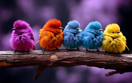 Colorful birds sitting on a branch with purple background, close up