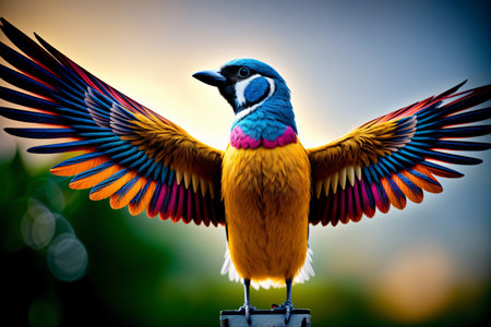 A stunning image of a vibrant bird with outstretched wings displaying its colorful feathers in a natural setting. Perfect for showcasing wildlife beauty and nature photography.