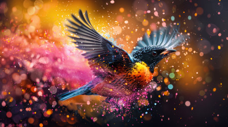 A bird in flight surrounded by colorful paint splashes, creating a dynamic and vibrant scene