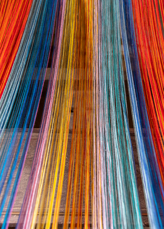 Colored threads of an ancient wooden loom .