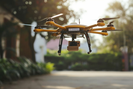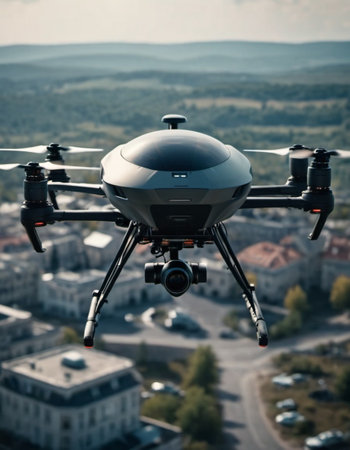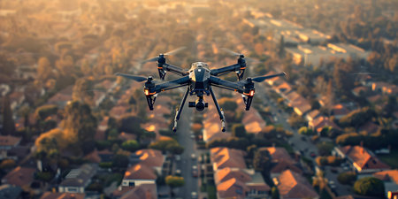 A high-tech combat drone hovers above a suburban landscape, capturing detailed imagery as it observes the area during the daytime. Its sleek design emphasizes advanced capabilities. Generative AI.