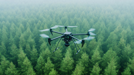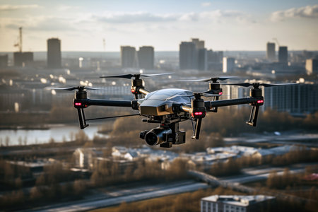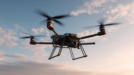 A modern drone is captured mid-flight against a picturesque sky, showcasing its sleek design and advanced capabilities. The blurred propellers emphasize its movement while the clear camera lens hints at its surveying purpose.