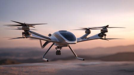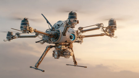 An advanced drone with visible camera and rotors is suspended in the air. The machine showcases innovative engineering with metallic limbs, set against a gradient sky providing a futuristic, serene ambiance.