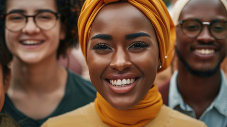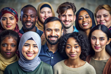 A group of people with different ethnicities and religious backgrounds are smiling for the camera. Concept of unity and diversity
