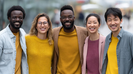 A smiling diverse group people outdoor casual clothing happy friendship together city urban