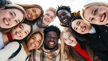 Global smiles: capturing joy in group selfies of cheerful and happy young people diverse nationalities, celebrating unity, friendship, cultural harmony in shared moments of happiness and togetherness