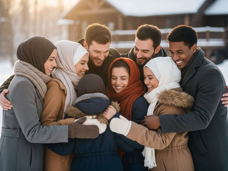 Group of multiethnic friends hugging and smiling while standing outdoors in winter
