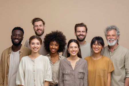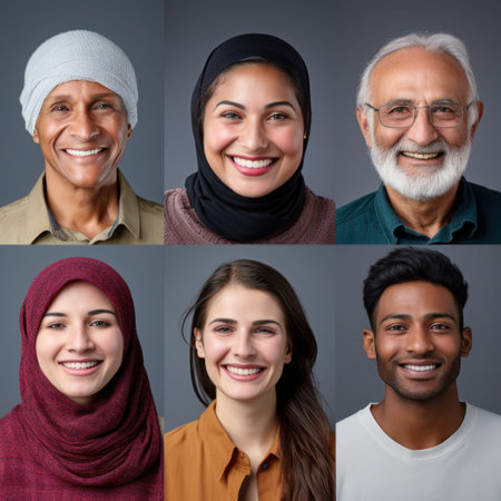 Portraits of smiling individuals showcasing diverse ethnic backgrounds against a neutral backdrop, conveying warmth and happiness in a friendly atmosphere