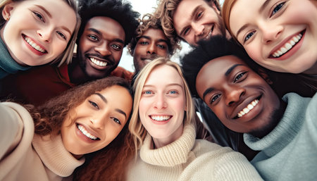Global smiles: capturing joy in group selfies of cheerful and happy young people diverse nationalities, celebrating unity, friendship, cultural harmony in shared moments of happiness and togetherness