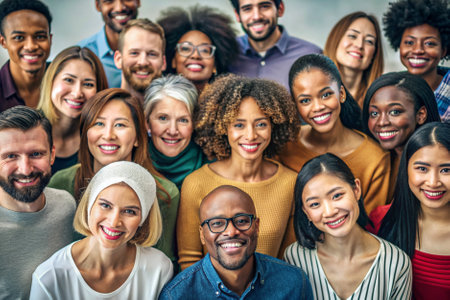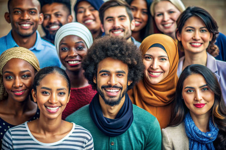 A vibrant tableau unfolds as people from diverse nationalities gather, representing a harmonious blend of cultures, backgrounds, and ethnicities, celebrating the beauty of multiculturalism and unity