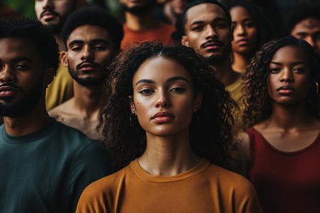 A diverse group of serious multi ethnic people including men and women of different ages stands outdoors in nature demonstrating unity and strength as a community.