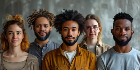 A diverse group of five individuals, each with unique hairstyles, clothing, and skin tones, stand against a colorful background and smile at the camera.