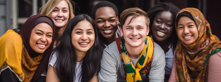 Diverse and happy young adults grouped together, symbolizing global friendship and harmony