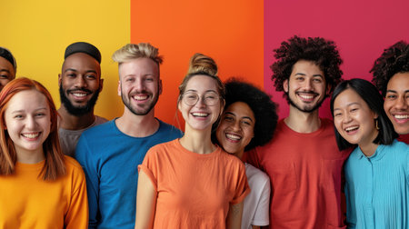 A diverse group of friends stands together in front of a colorful wall, each wearing a vibrant shirt. The group is made up of people of different races and ethnicities. They are all smiling and appear to be enjoying each others company. The colorful background adds to the cheerful atmosphere of the photo, making it a perfect representation of diversity and friendship.