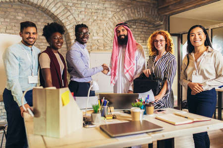 Multicultural business people meeting and talking about business. Arab businessman shaking hands with his business partner.