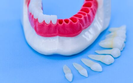 Teeth next to the human celestial. Concept - teeth fall out. Visual aid for dentists. Training of orthodontists. Realistic jaw model with pulled out teeth. Concept - the loss of teeths.