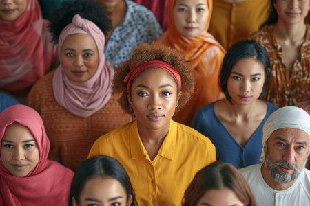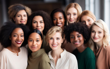 Portrait of multi-racial women standing together, their expressions confident and proud, celebrating sisterhood.