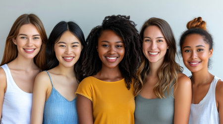 Diverse group of smiling women with different skin tones and hairstyles looking at the camera on a neutral background. Beauty and inclusion concept.