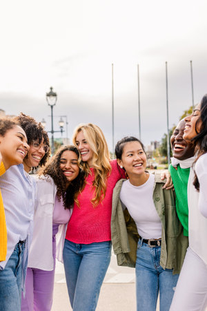 Multi ethnic group of young women hugging outside, Happy girlsfriends having fun laughing out loud on city street, Female community concept with cheerful girls standing together, Women power.