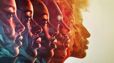 dramatic collage of faces, different races and ethnicities, fostering acceptance and embracing diversity.