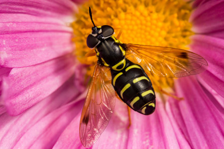 hoverfly on a chrysanthemum flower. colorful detailed macro photo of an insect. wildlife. close-up. Helophilus pendulus. Hoverfly. sun fly.