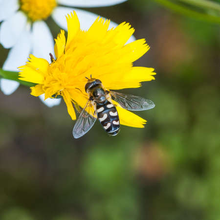 Natural closeup on a white striped sawfly species, Tenthredo koehleri in a yellow dandelion flower, Taraxacum officinale