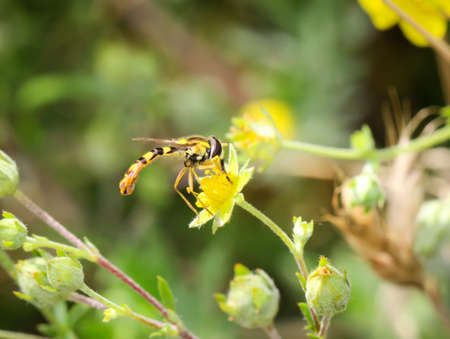 Red-banded wasp collecting nectar from a wild blossom in the meadow.