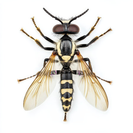 A striped insect is displayed against a white background showcasing its wings body structure and unique color patterns in meticulous detail.