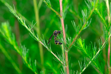 closeup potter wasp flying in garden.