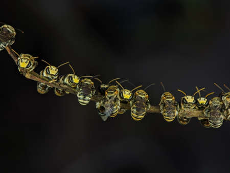 A group of stingless bees resting on a tree branch.