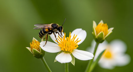 A detailed macro shot of a honey bee perched on a white wildflower with a yellow center, collecting pollen. The insect is sharply focused against a soft, blurred green background, highlighting nature's pollination process.