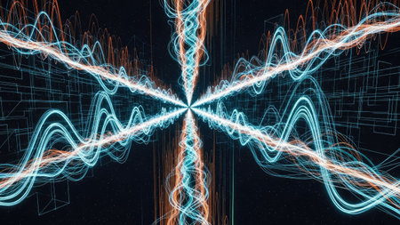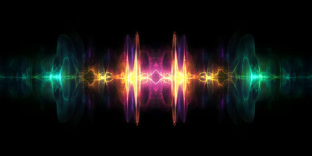 An abstract digital artwork depicts symmetrical, intersecting waves of colorful light on a black background. The intricate patterns of energy lines represent concepts like sound waves, quantum physics, data frequencies, or spiritual energy.