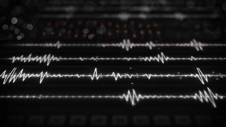 Audio waveform equalizer on monitor. Abstract technology concept. Computer generated image rendered with DOF